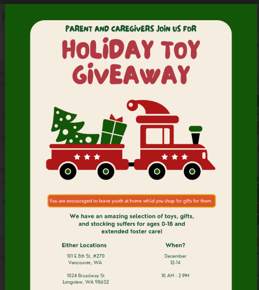 2025-12-12 2026 CCCA Holiday Shop 2026 CCCA Holiday Shop December 12, 2025 @ 10:00 am - December 14, 2025 @ 2:00 pm 2026 CCCA Holiday Shop Cowlitz and Clark County Child Advocates is hosting our 5th annual Holiday shop. We will serve families who are receiving...